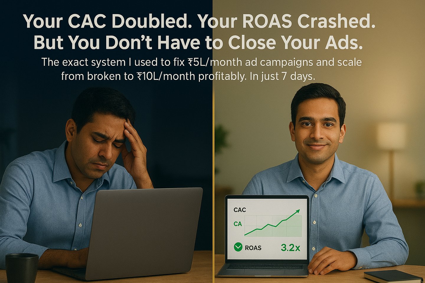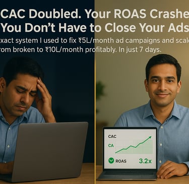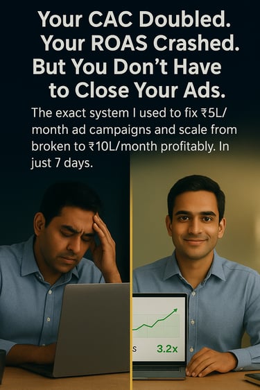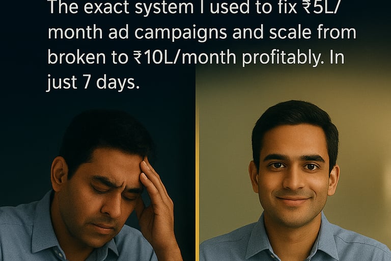 ”I was spending ₹6L/month and losing money. After Chapter 2, I diagnosed the exact problem (creative decay). Implemented 3 tactics from Chapter 3, and in 2 weeks ROAS went from 1.2x to 2.8x. Then I scaled using the 4-phase model. Now at ₹15L/month spend profitably..”